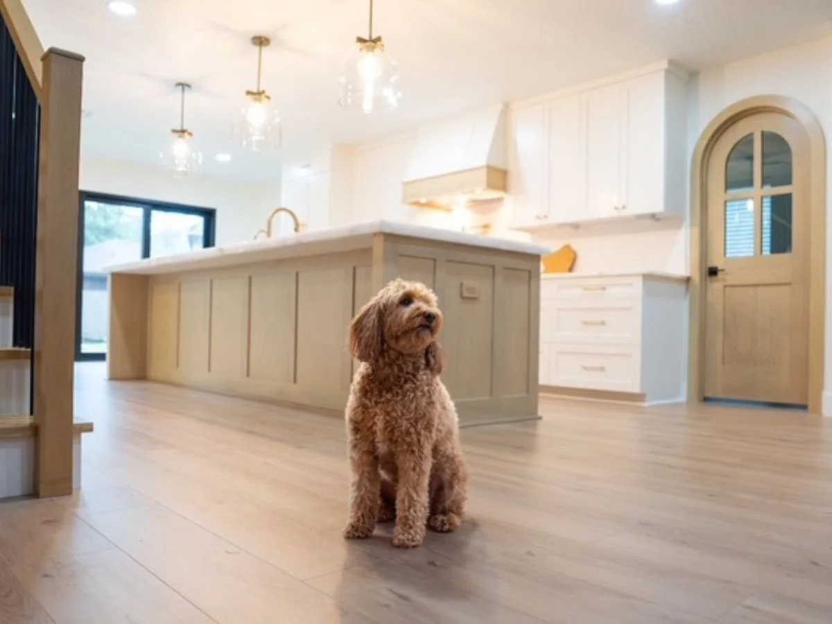 Wide-plank, light-toned wood floors visually expand the home and add warmth against the brighter finishes.